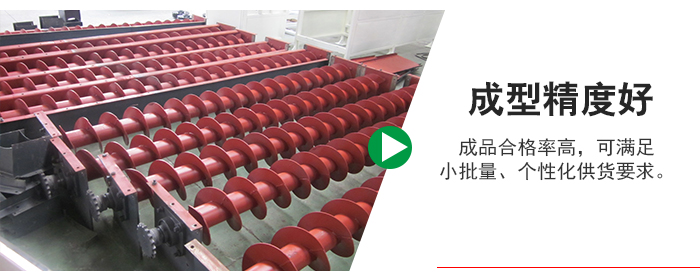 4、 与连轧技术相比,成型精度好,成品合格率高,可满足小批量、个性化供货要求,特别适用于大规格,大厚度及耐磨钢、不锈钢材料的螺旋叶片生产。