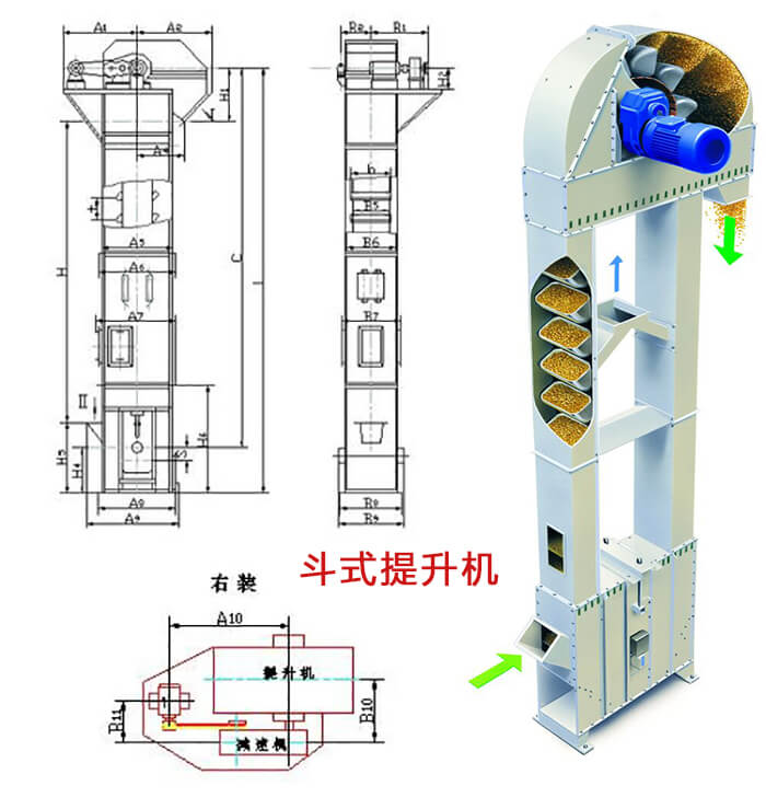 斗式提升机料斗把物料从下面的储藏中舀起,随着输送带或链提升到顶部,绕过顶轮后向下翻转, 斗式提升机将物料倾入接受槽内。