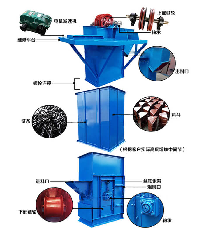 垂直斗式提升机是利用传动首尾相接的牵引带,带动多个小斗运动,从低处向高处输送物料的设备。