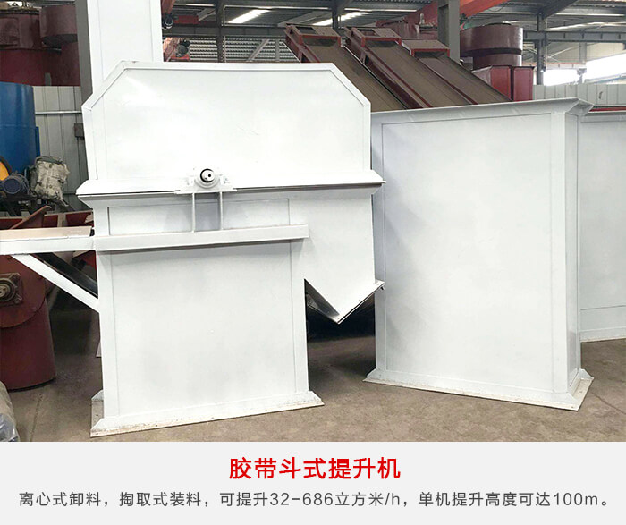 胶带斗式提升机采用离心式卸料,掏取式装料,钢丝绳胶带强度大,可提升各种粉状、粒状和块状,可提升32-686m3/h,单机提升高度可达100m,易损件少,维护费用比一般斗式提升机减少80%以上。