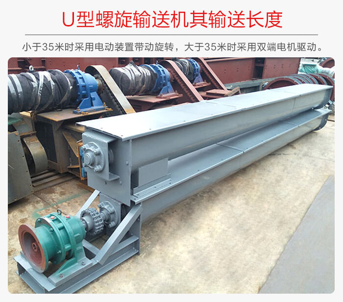U型午夜看片网站的输送长的有两种,其一:壳体长度小于35m的其螺旋轴是采用一端单电动装置带动主轴的旋转,而当其长度大于35m时就可采用两端双电动装置带动主轴旋转。