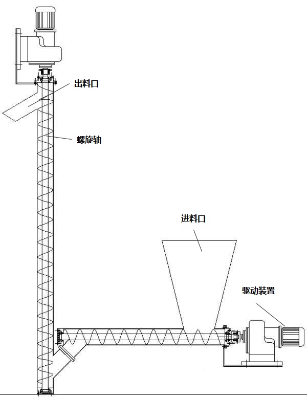 物料随螺旋高速旋转,被输送的物料从水平部分的进料口加入,通过旋转的水平进料螺旋送入输送机和垂直部分,然后将物料向上推至出料口出料口由垂直螺旋,物料随螺杆高速旋转,被输送的物料从水平部分的进料口加入,通过旋转的水平进料螺旋进入输送机。和垂直部分,然后用垂直螺旋将物料推到出料口排出。