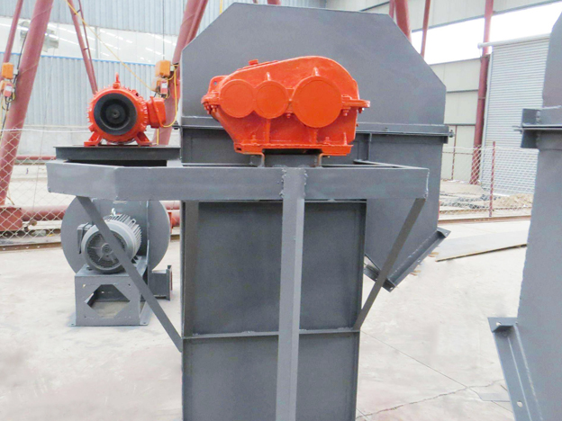 料斗在传动链条上均匀分布,传动板链就像长龙相似盘旋在斗式提升机机头和机尾旋转滚筒上,由于电机的驱动利用减速机、联轴器传动滚筒转动皮条或链条循环转动,在循环转动时上面分布的料斗走到底部料仓出料口时,把物料吸入料斗,转身去往上出料口,把物料吐入出料仓,料斗交替循环吸料吐料把物料输送完。