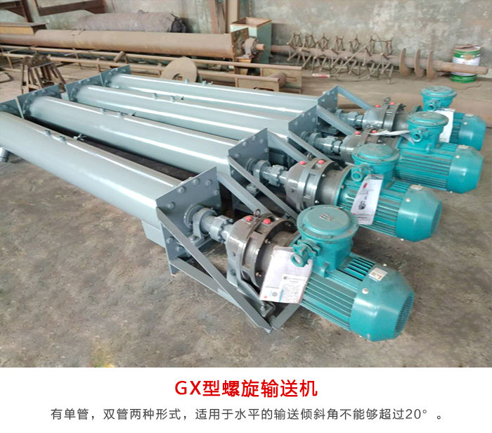 GX型午夜看片网站有单管,双管两种形式,适用于水平的输送倾斜角不能够超过20°。可输送一些块状的(小块状物料)例如:麦子,玉米,黄豆等粮食。