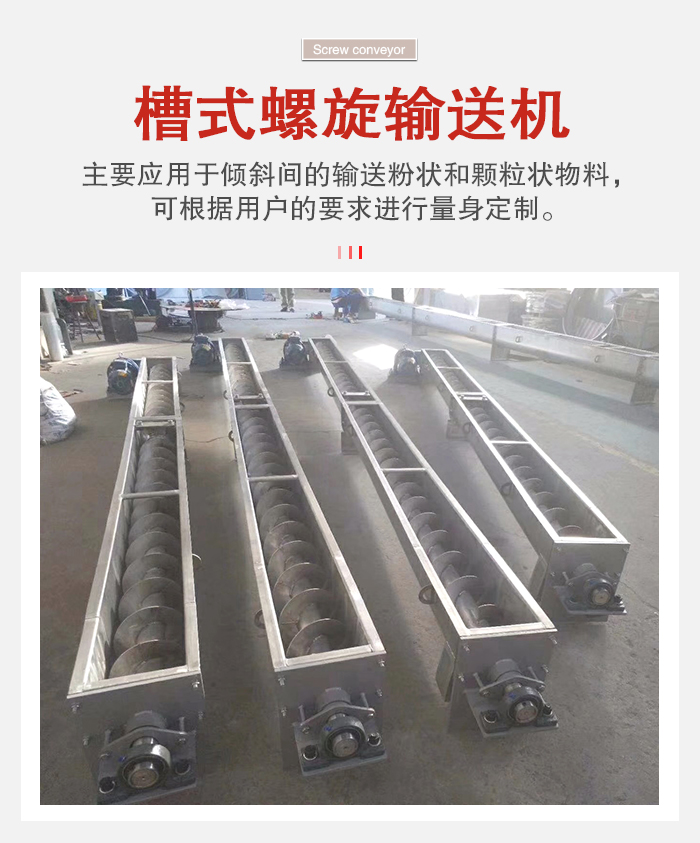 槽式午夜看片网站又称螺旋给料机,主要应用于倾斜间的输送粉状和颗粒状物料,可根据用户的要求定制成不同直径,不同长度,不同倾斜度,并可配套安装调速电机,已连续的调节转速,达到定量给料的目的。