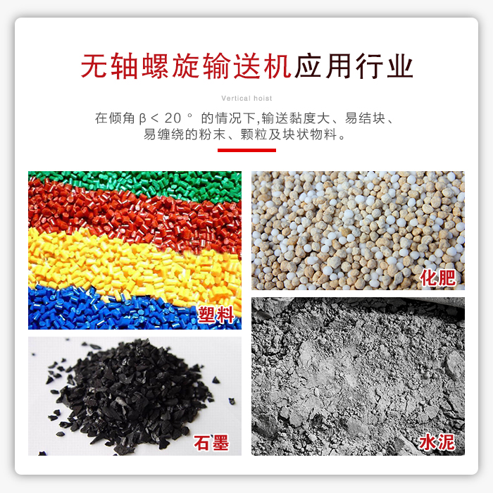 无轴午夜看片网站广泛用于食品、医药、化工、 建筑等部门,在倾角β< 20 °的情况下,输送黏度大、易结块、易缠绕的粉末、颗粒及块状物料。