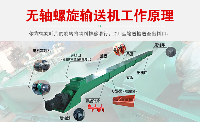 无轴午夜看片网站由驱动机构(电机减速机、传动轴)、U型槽与支架、无轴螺旋、衬条、盖板、进料口、出料口、紧固件等部件组成。当物料从输送机的进料口进入,依靠螺旋叶片的旋转将物料推移滑行,沿U型输送槽送至出料口,并与压榨机或垃圾小车配套,将物料进行下一步处理。