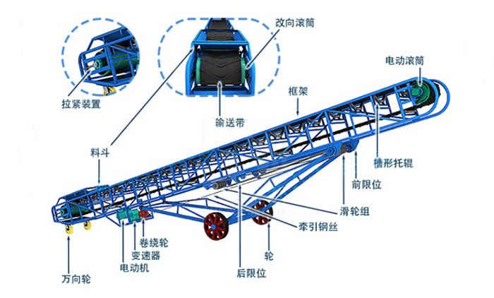 带式输送机主要由输送带、驱动装置、滚筒、托辊、张紧装置、清扫装置等组成。输送带是输送机的主体部件,用于承载物料并传递动力。驱动装置通常包括电动机、减速器和联轴器,提供动力驱动输送带运行。滚筒用于支撑和传递输送带的运动力,托辊支撑输送带并减少摩擦。张紧装置用于调整输送带的张紧度,保持适当的张力。清扫装置用于清除输送带上的杂物,保持输送带清洁。这些组成部分协同工作,使带式输送机能够高效、稳定地完成物料的输送任务。