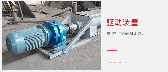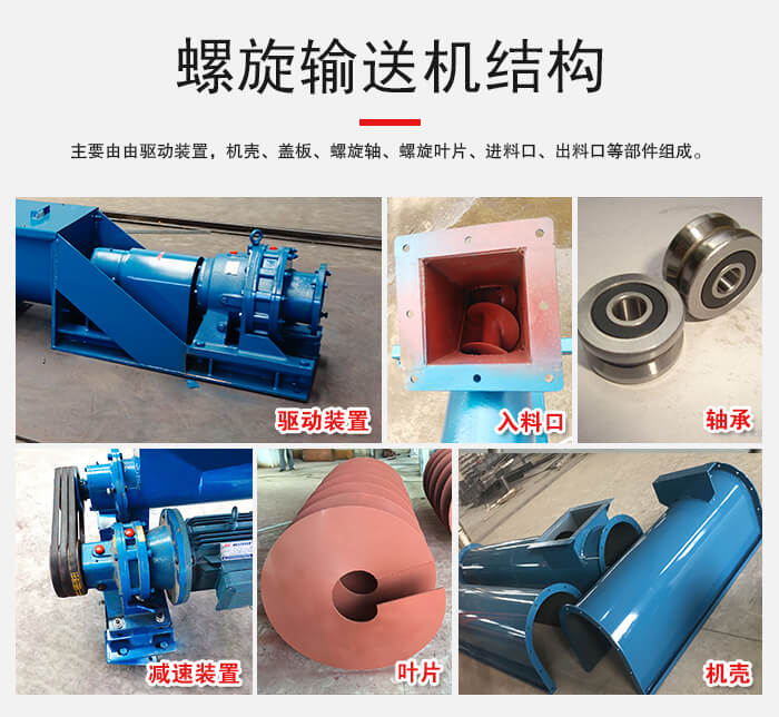 主要由由驱动装置,机壳、盖板、螺旋轴、螺旋叶片、进料口、出料口等部件组成。
