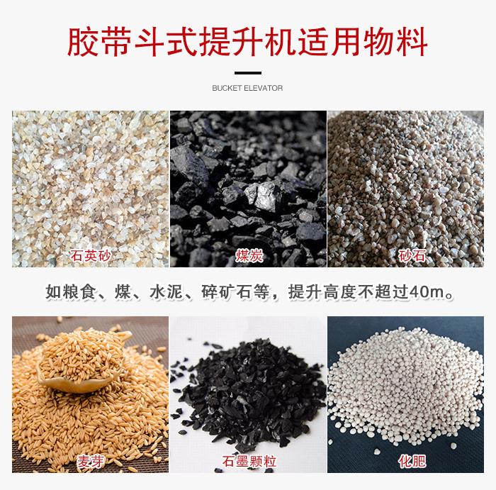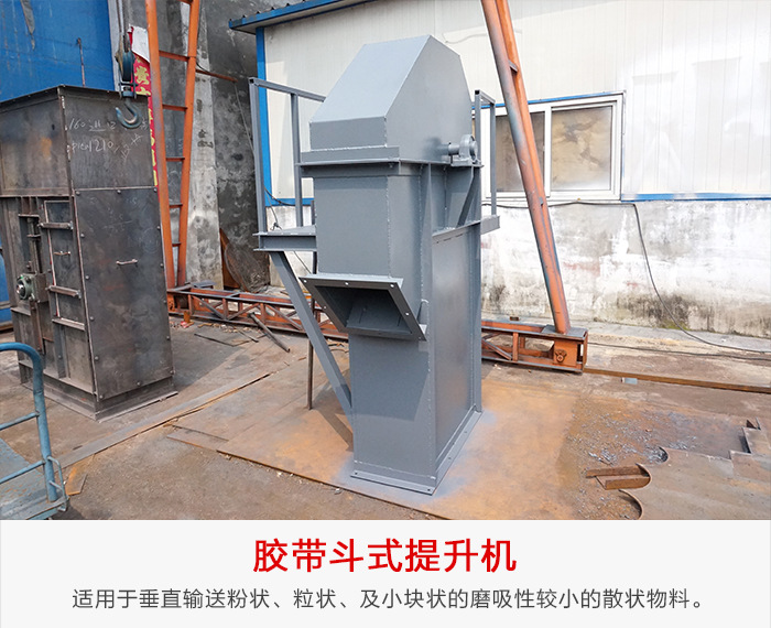 胶带斗式提升机由运行部分(料斗与牵引胶带),带有传动滚筒的上部区段,带有拉紧滚筒的下部区段,中间机壳,驱动装置,逆止制动装置等组成,适用于向上输送松散密度ρ<1.5t/m3粉状、粒状和小块状的无磨琢性和半磨琢性散状物料,如煤、砂、焦末、水泥、碎矿石等。