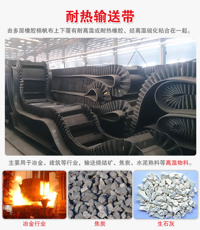 耐热输送带是由多层橡胶棉帆布(涤棉布)或者聚酯帆布上下覆有耐高温或耐热橡胶、经高温硫化粘合在一起的,可以输送175℃以下热焦碳、水泥、熔渣等物料,主要用于冶金、建筑等行业,输送烧结矿、焦炭、水泥熟料等高温物料。