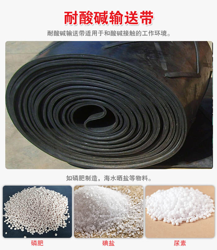 耐酸碱输送带适用于和酸碱接触的工作环境,如磷肥制造,海水晒盐,覆盖胶采用橡塑共混并填充算碱性优异的性情材料, 比氯丁橡胶耐酸碱输送带耐酸碱性能更优。