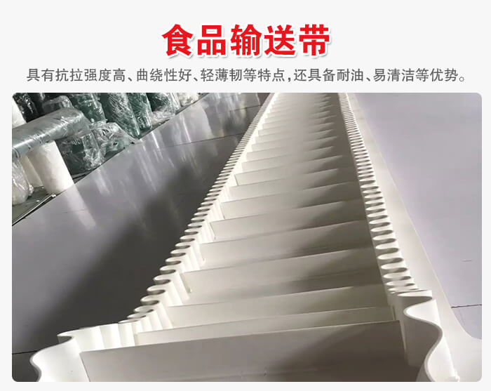 食品输送带材质有PVC、聚乙烯、聚炳稀、PP、塑钢ACETAL、PE、尼龙、PA等,按照具体食品都有相应的专用输送,除了具有抗拉强度高、曲绕性好、轻薄韧等特点外,还具备耐油、卫生、干净卫生、易清洁等优势,是食品行业理想的输送带。
