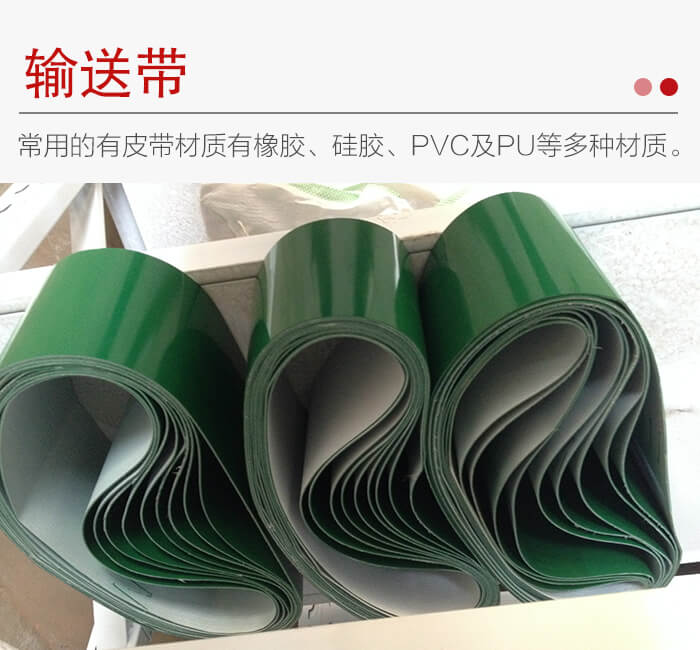 在皮带输送机上常用的有皮带材质有橡胶、硅胶、PVC及PU等多种材质。橡胶带适用于工作环境温度-15至40℃之间。物料温度在50℃以下,50℃以上的要求在订货时需告知厂家,可以选用耐高温输送带。向上输送散粒料的倾角12°至24°。对于大倾角输送可用裙边带。