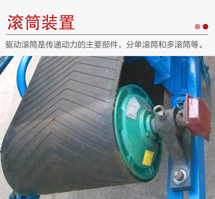 皮带输送机滚筒装置分为驱动滚筒和改向滚筒。驱动滚筒是传递动力的主要部件,分单滚筒(胶带对滚筒的包角为210°至230°)、双滚筒(包角达350°)和多滚筒(用于大功率)等。